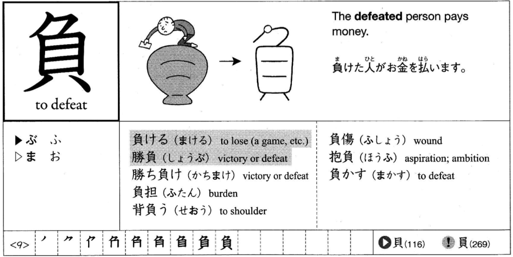 - 負う (おう) – to receive (wound); to incur (damage); to be injured (page 37)